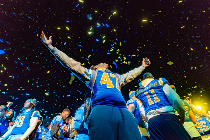 Los Angeles, Calif. — UCLA linebacker Shea Pitts from Agoura Hills, Calif., celebrates ahead of the storied UCLA-USC rivalry game in the 2019-2020 season. Though UCLA fell to USC 52-35 at the Coliseum, the game is remembered as their last matchup before the COVID-19 pandemic reshaped college sports.